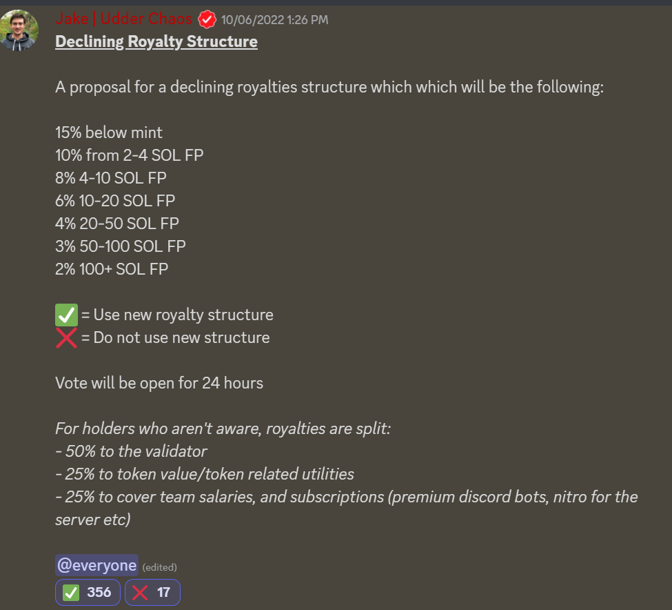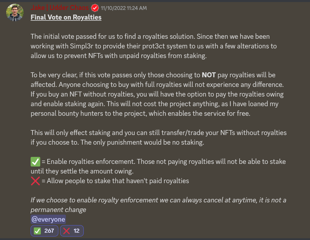 From the beginning of Udder Chaos, we have had a goal of not being reliant on royalties. That said, royalties are a very beneficial additional source of revenue. After putting royalties to vote, holders voted on a declining royalty structure and staking enforced royalties.&#x20;